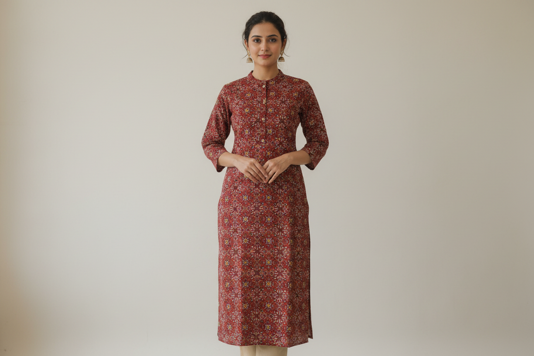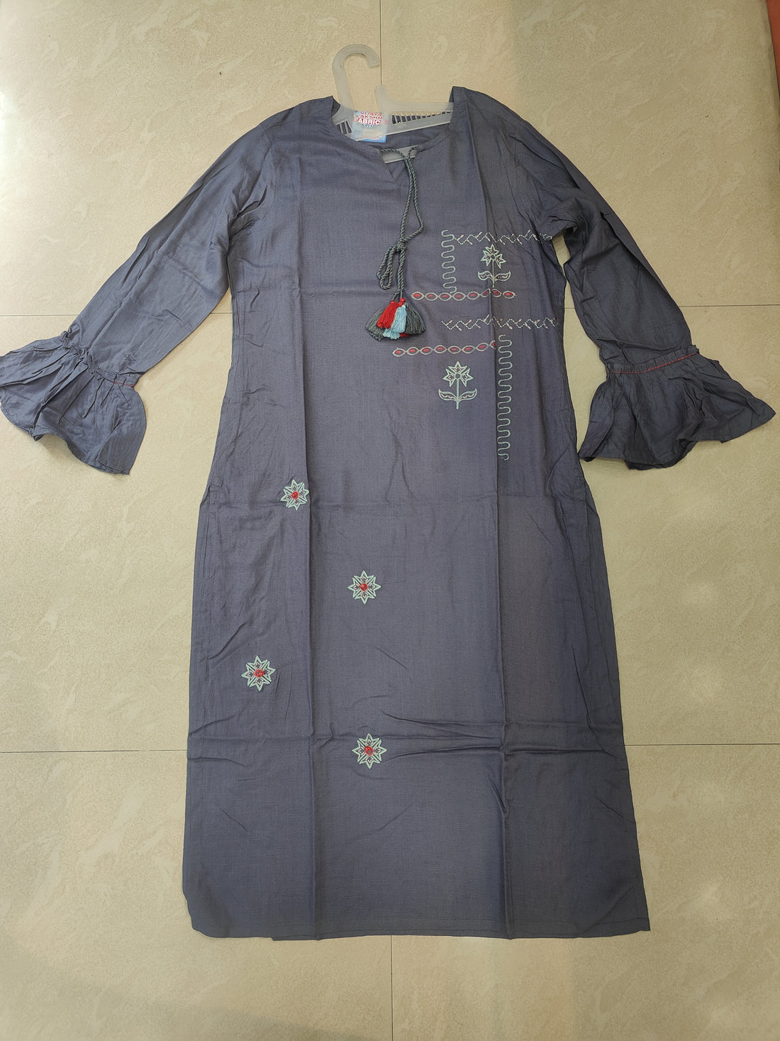 The Chocolate Shade Full Embroidered Linen Fabric Straight Kurti combines the breathable properties of linen...