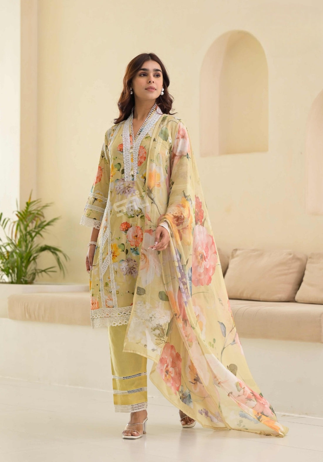 Cotton floral printed with embroidery 3 piece set with digital style duppata
