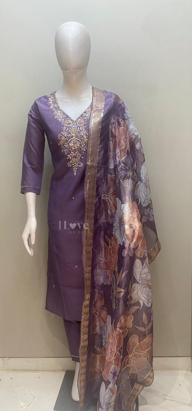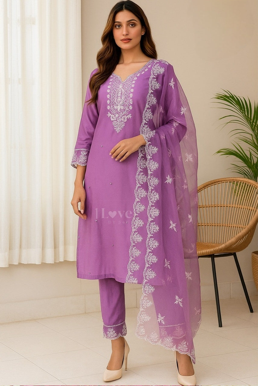 Lavender shade embroidered Muslin silk 3piece kurti set with organza duppata