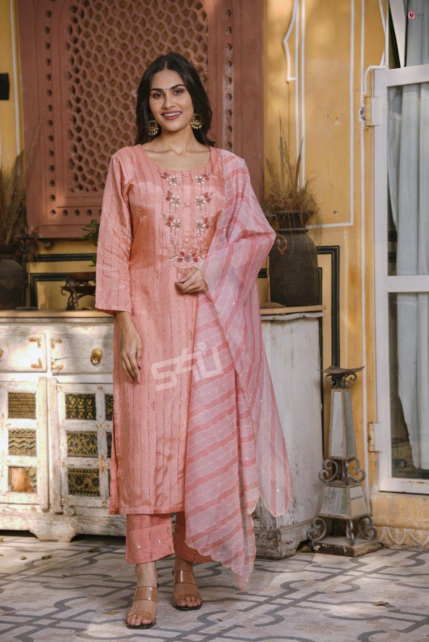 Muslin silk pink with beats work 3piece set with organza duppata