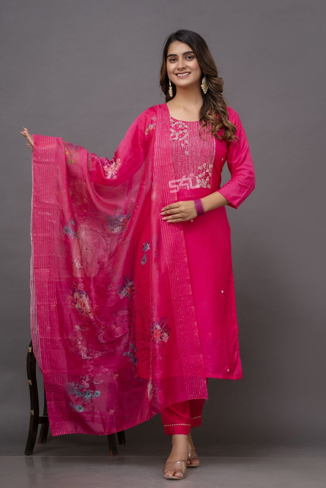 Experience luxury and elegance with our Muslin silk 3piece set. Featuring a beautiful shiney pink...