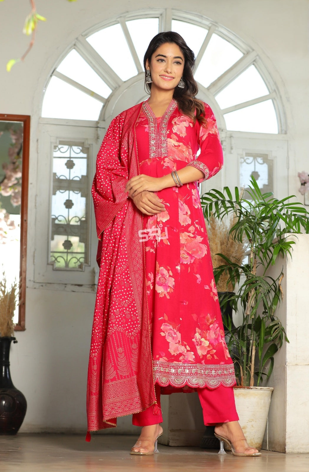 Heavy Rayon floral pink shades embroidered 3piece frock model set with Rayon dupatta