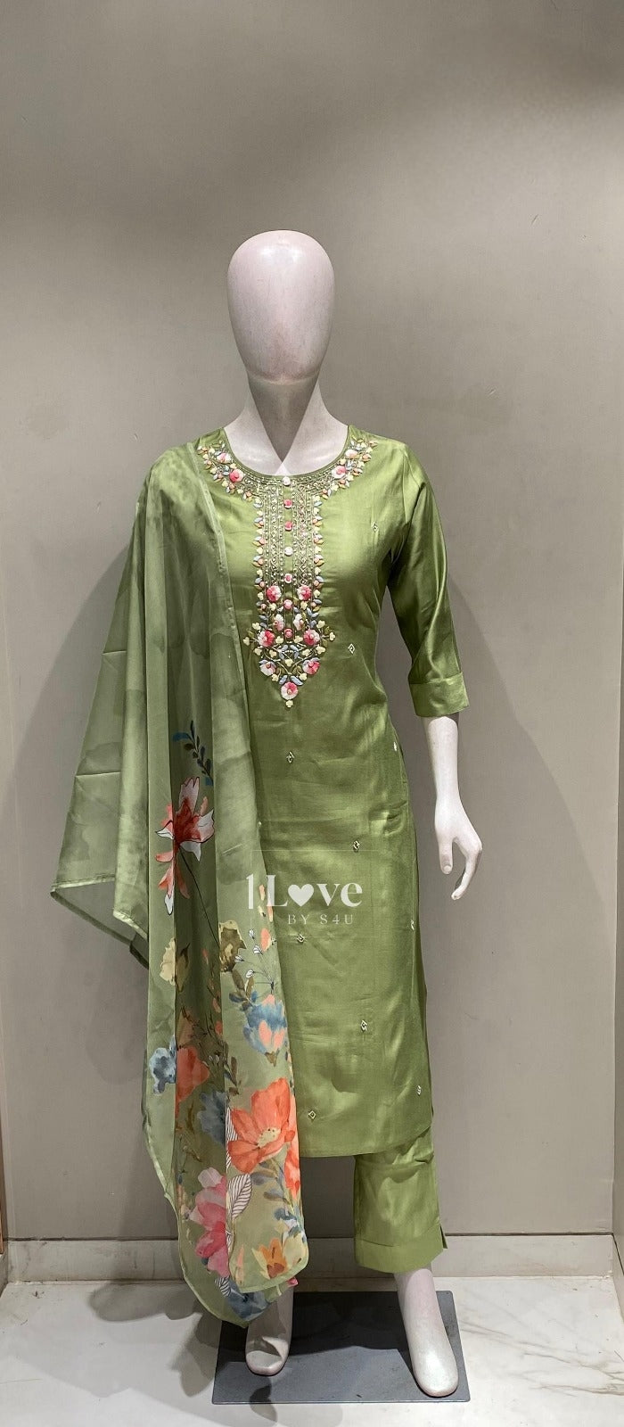 Olive green imported material with thread work 3 piece kurti set and with digital print...