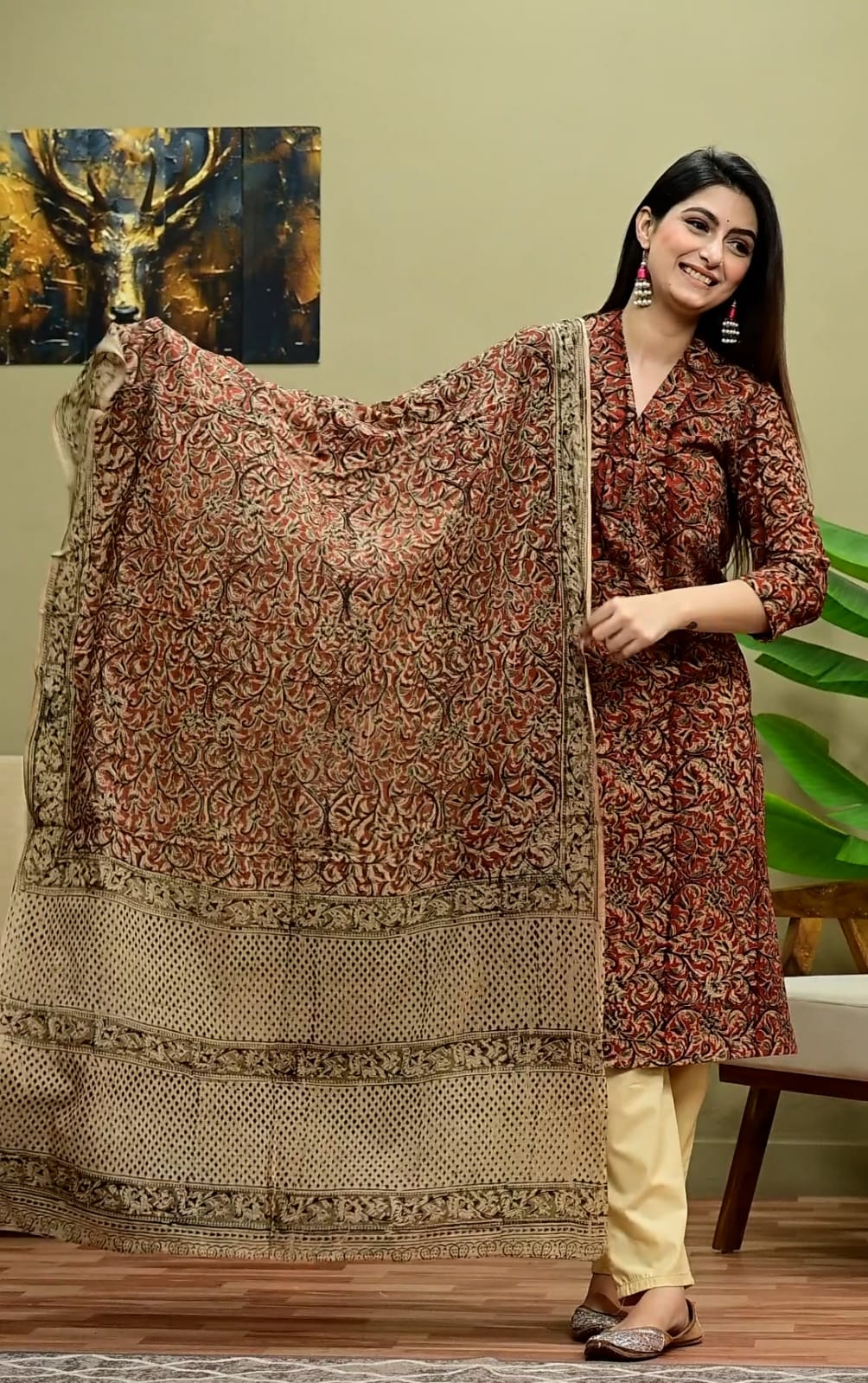 This Kalamkari 3piece kurti set comes with a long duppata and free size pant, making...