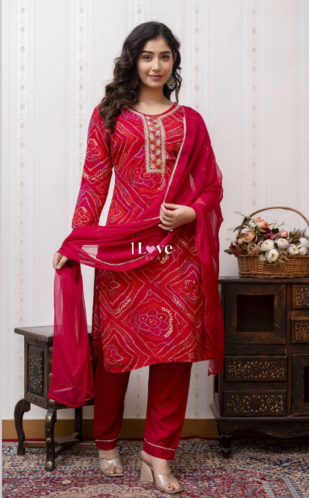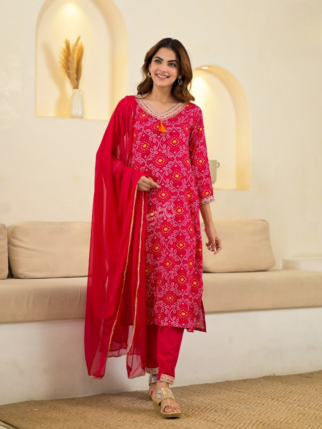 Rayon cotton bandini style 3 piece kurti set with dupatta