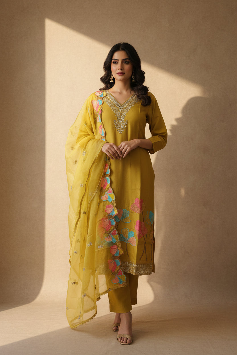 Mustard yellow shine shade 3 piece set with hand work for party wear.
