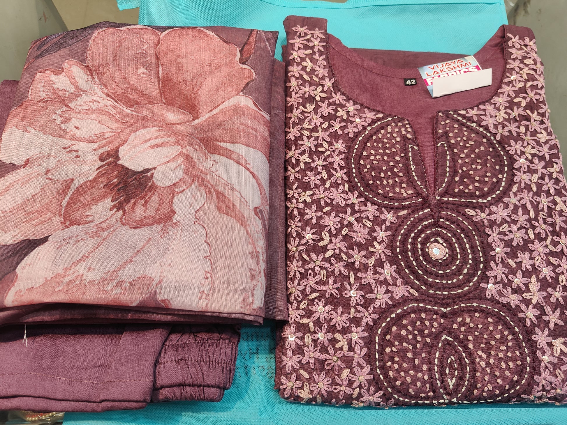 Chocolate shade embroidered fancy style 3 piece kurti set with floral dupatta
